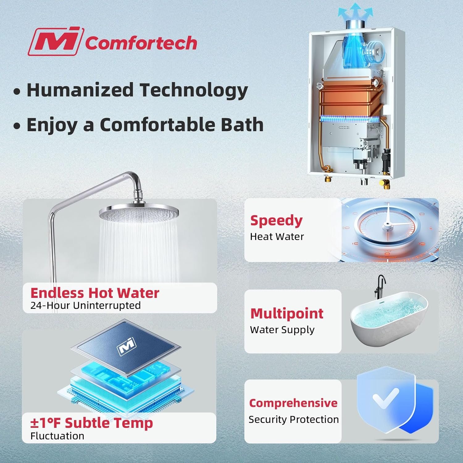 The CS120 natural gas tankless water heater provides a compact and efficient solution for your home’s hot water needs. With a maximum temperature of 149°F and a flow rate of up to 5.1 GPM for 40 minutes, this unit can supply nearly 300 gallons of hot water. Its precise temperature control ensures consistent comfort, adjustable from 95°F to 149°F. Designed for indoor installation, this tankless heater is compatible with most existing vents and pipes, making it an ideal choice for medium to smaller homes with 1-2 bathrooms.